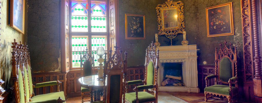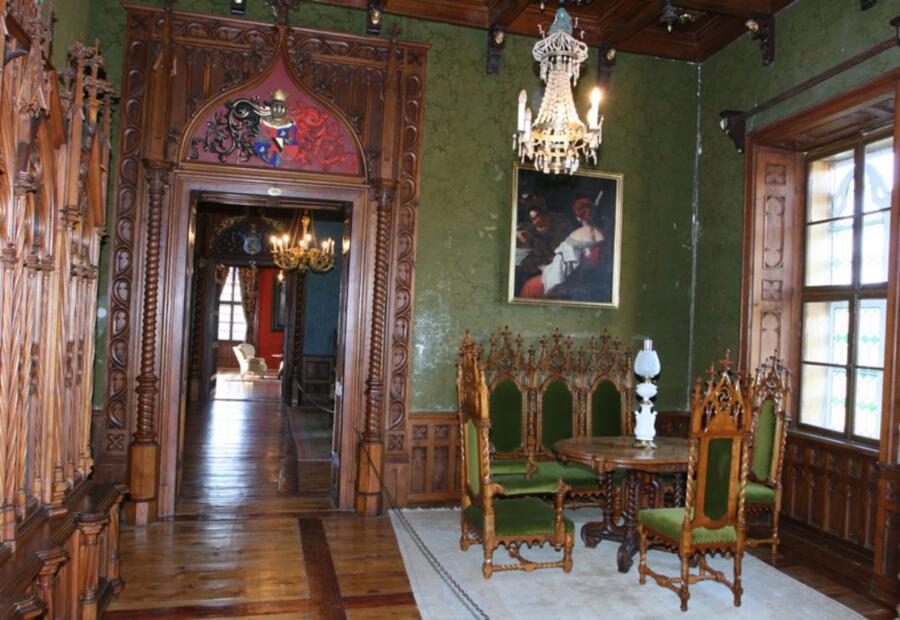 Namještaj malog salona za čitanje izrazitih je neogotičkih oblika. Čine ga: veliki ormar koji je služio za smještaj knjiga, trosjed, stolice i naslonjači. Sačuvane originalne plišane tapete iz vremena obnove dvorca koloristički usklađene s ostalom draperijom jasno dočaravaju salonski ugođaj druge polovice 19. st.