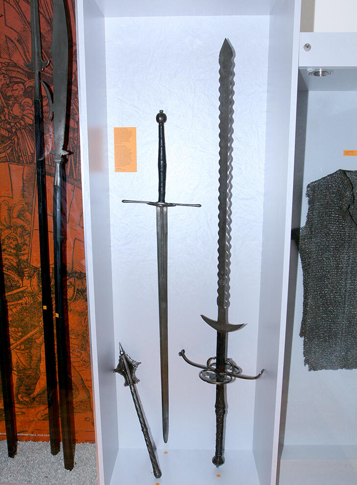 U samoj borbi dvoručni su mačevi bili slabo upotrebljivi i već u drugoj polovici 16. stoljeća njihova se primjena veže uz naoružanje počasnih pratnji i straža, te naročito zastavne straže vojvoda i vojskovođa. Dijelovi mačeva se počinju ukrašavati, a tehnike i motivi ukrašavanja u duhu su kasne renesanse i postaju toliko maštoviti i raznoliki da se to oružje više nije moglo smatrati rekvizitom za borbu, već više kao znamen časti, vlasti i ceremonijala. Naročito se to odnosi na izvijene lukove križnice, prstena za pariranje i bočnih lukova, te na valovite bridove sječiva tzv. "plamenih mačeva" (Flamberg).